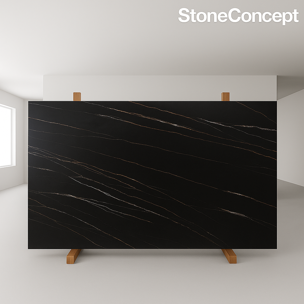 Lauren Gold, placa de piedra tecnológica de color negra con hermosas vetas delgadas y doradas, ideal para tu cocina por su resistencia y precio.